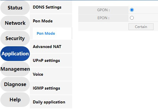 Переходим на вкладку Application-Pon Mode, выставляем GPON , нажимаем кнопку «Certain», перезагружаем ONU