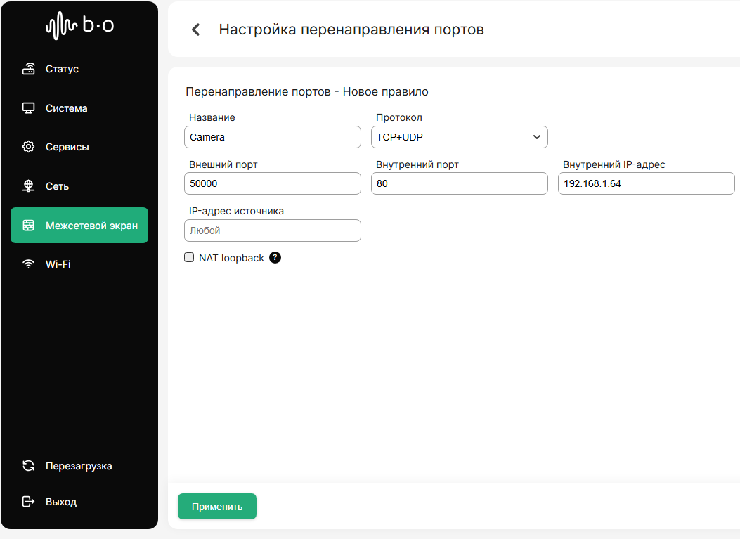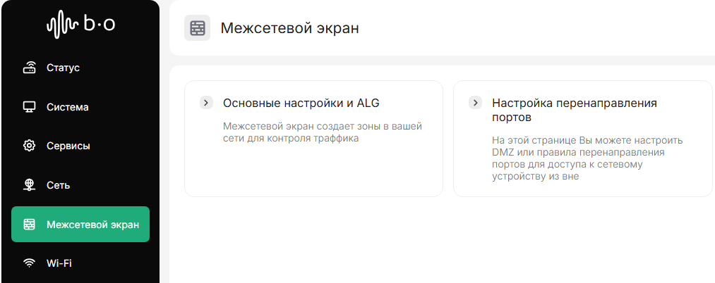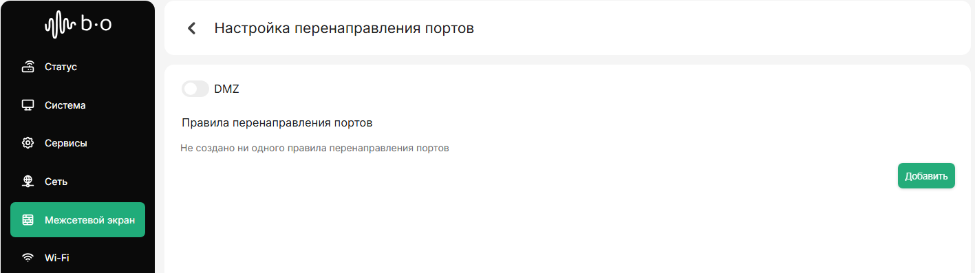 В левом меню переходим на вкладку “Межсетевой экран”, далее переходим в “Настройка перенаправления портов”