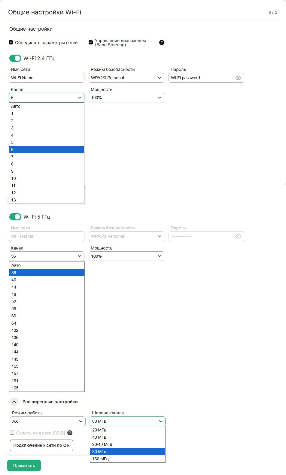 В разделе “Wi-Fi 5 ГГц”, в “Канал” можно выбрать желаемый канал, либо выставить “Авто” – автоопределение канала