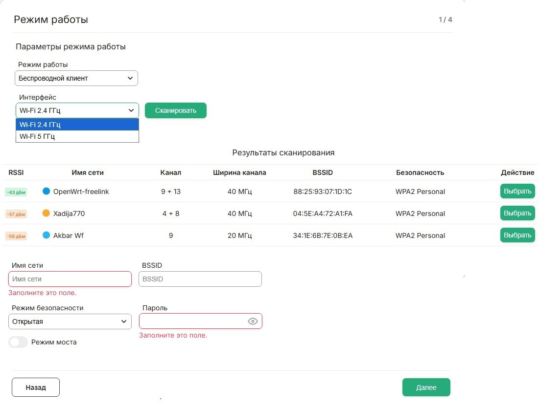 В появившемся списке выбираем нужную нам ведущую сеть кнопкой “выбрать”, после чего поля “Имя сети”, “BSSID” и “Режим безопасности” автоматически заполнятся данными от ведущей сети