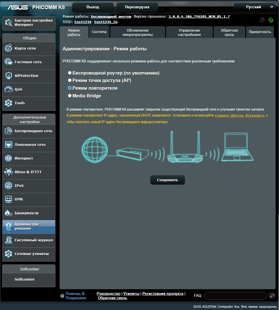 включаем соответствующий переключатель "Режим повторителя"