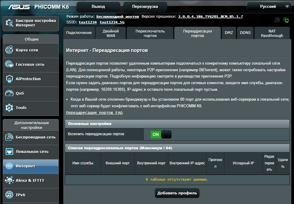 включаем переключатель "Включить переадресацию портов"