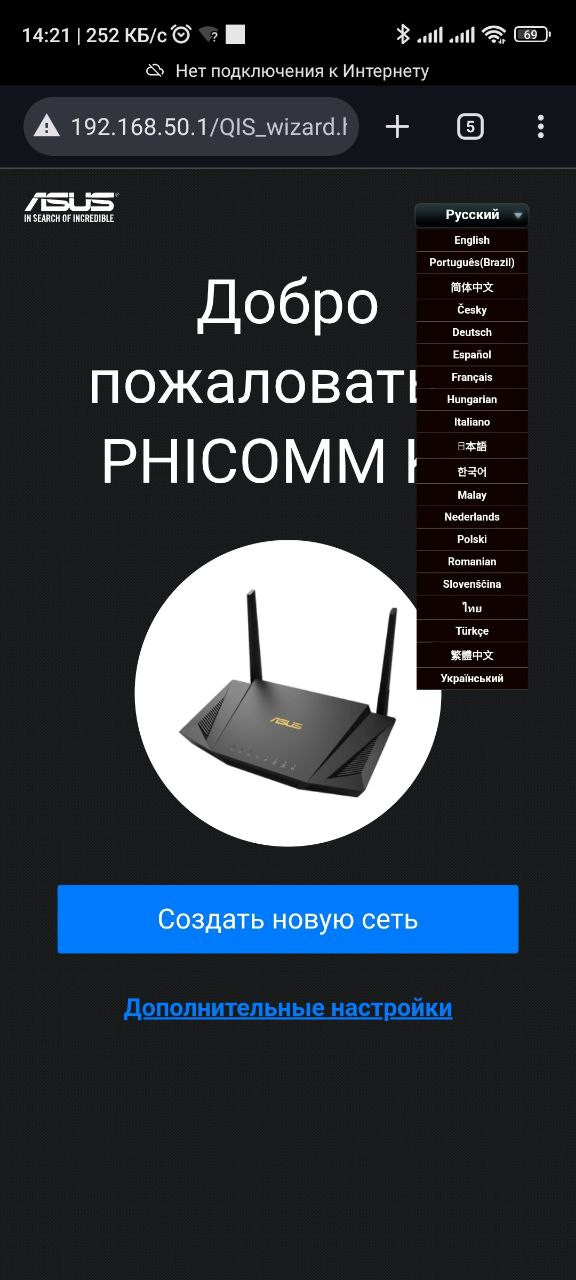 Откройте любой веб-браузер, введите в адресную строку: 192.168.50.1 и нажмите Enter. Откроется стартовая страница в которой нужно в правом верхнем меню выбрать желаемый язык и нажать "Создать новую сеть"