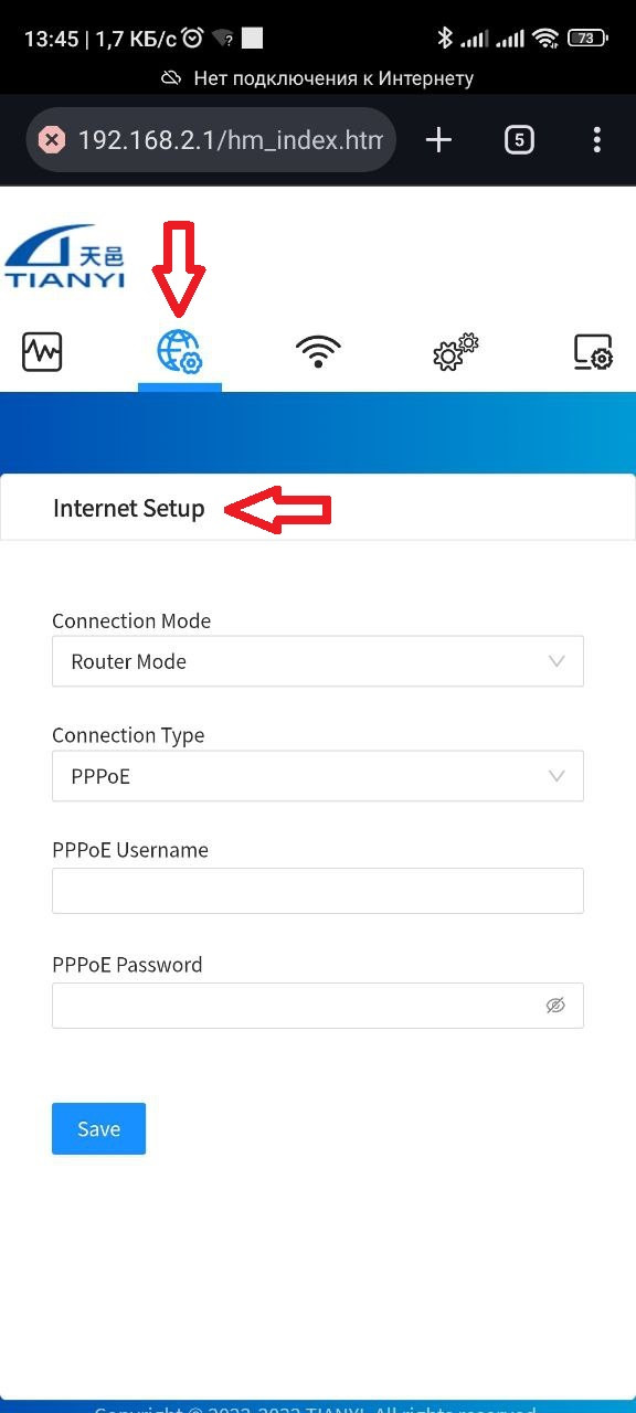Откройте любой веб-браузер, введите в адресную строку: 192.168.2.1 и нажмите Enter. Откроется страница настроек роутера