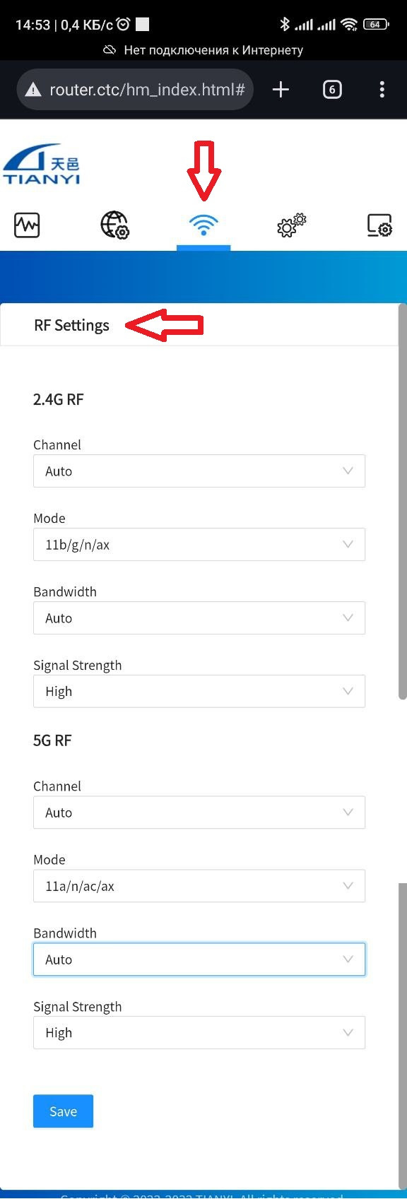в верхнем меню нужно выбрать "Wireless Setup" и в выпадающем меню перейти в пункт "RF Settings"