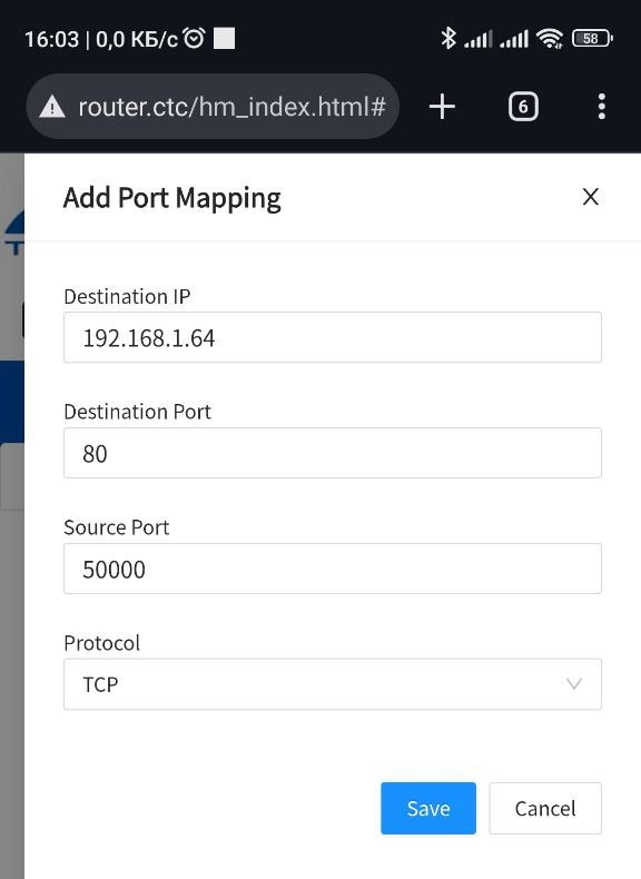 Теперь мы можем получить доступ до локального устройства, введя на удаленном устройстве внешний (белый) ай-пи адрес роутера и внешний порт, например 91.234.219.250:50000